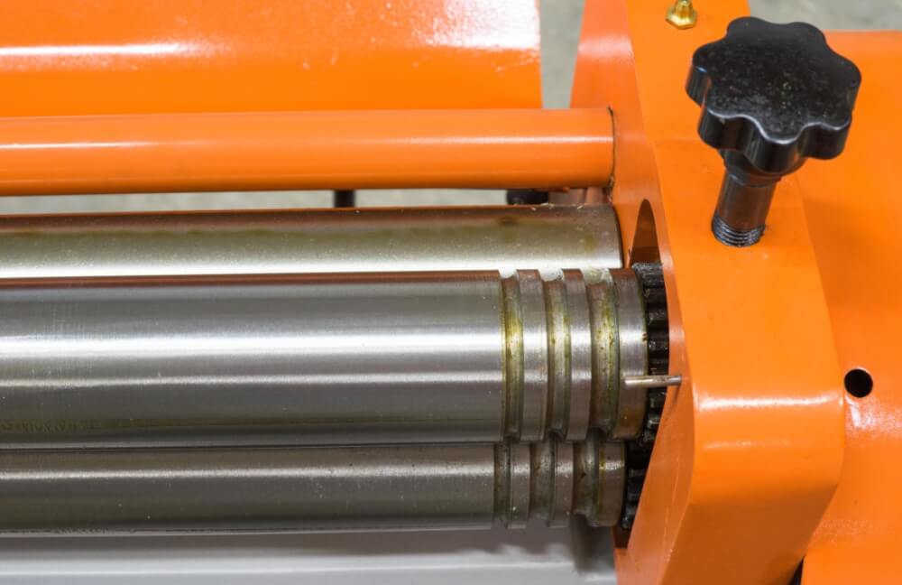 Вальцы с диаметром 60 мм. Вальцы имеют трёхваловую конструкцию, верхний вал консольно отводится в сторону для съёма обечайки.